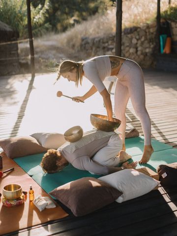 Yoga im Morgenlicht: Auf der Plattform im Einklang mit der Natur atmen.
